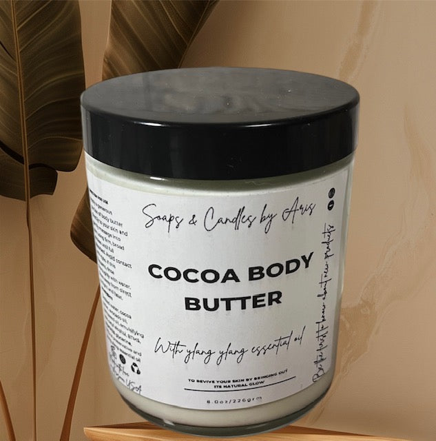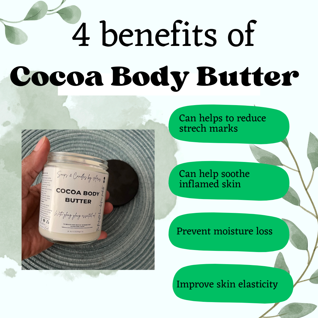Cocoa Body Butter is made with natural cocoa butter and essential oils, specially formulated to reduce stretch marks, improve skin elasticity, and combat dryness and inflammation. Enjoy the benefits of deeply nourished and hydrated skin with this luxurious body butter.