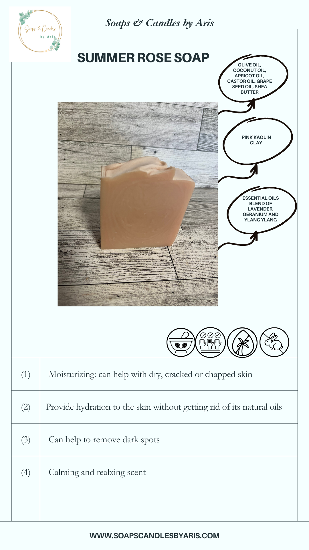 🌞✨Indulge in a lush blend of nourishing oils and floral aromatherapy with Summer Rose, a handcrafted soap that captures the gentle elegance of a summer garden in bloom. Made with skin-loving botanicals and clay, it’s perfect for everyday self-care with a touch of luxury.